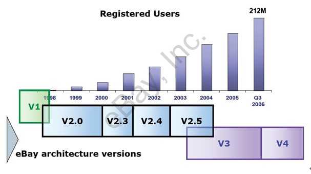 ebay的系统架构的变迁主要经历了4个阶段,下面一幅图展现了ebay系统架构变迁的时间表