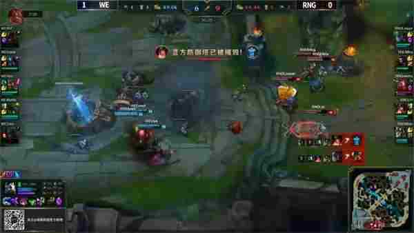 30分钟WE送给了RNG一波大节奏啊!趁着老鼠在上路清兵的空隙,RNG直接五人推下。而WE却有些冲动的直接开团,被RNG抓住机会杀死了两人之后推掉了自己的下路高地。老鼠来的太晚了,WE其他人也是有点冲动了。