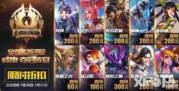 打开获得以下冠军-eStar战队精选英雄:宫本武藏,花木兰,露娜,刘邦,孙尚香