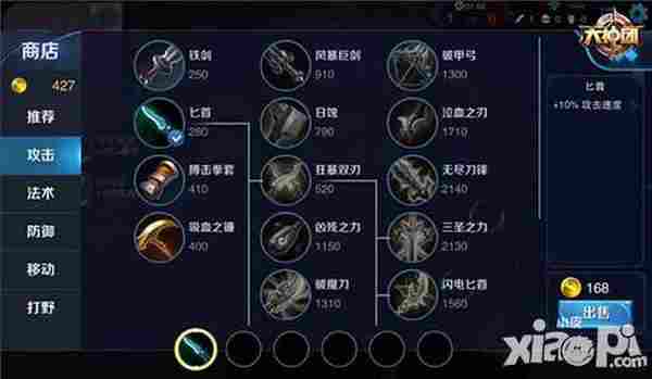 匕首对于射手英雄来说再合适不过了。攻击速度加10%,售价280金币。攻速装对于射手英雄是必备的。射手英雄本身攻击就高,在前期技能少,蓝不足的情况下,通过普攻来补兵,多多消耗对手,就能滚雪球似得把自己经济建立起来,装备堆起来。