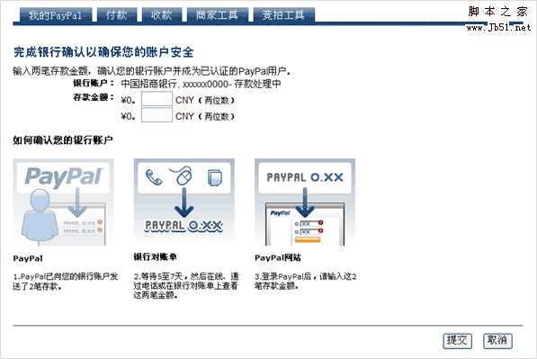 5. 等待5~7个工作日,然后通过银行卡的网上银行,电话,或银行对账单,均可查看到,2笔小额存款存入您的银行账户。如下图所示