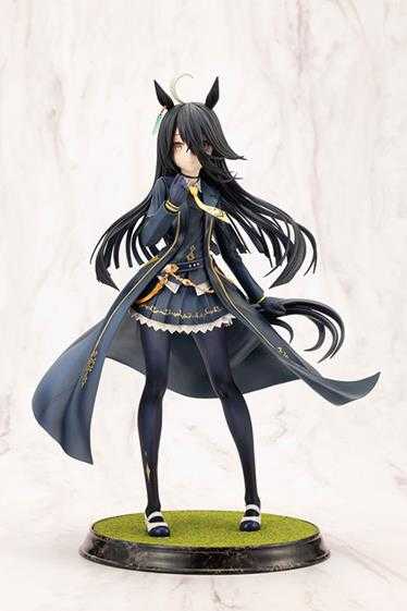 来自《赛马娘Pretty Derby》,存在感薄弱的神秘马娘,据说能看见常人看不见的事物,会用指尖描绘出奇妙的图案的曼城茶座以决胜服造型进行立体化。黑色长发搭配上头顶那一抹白色呆毛,可爱的马耳矗立着。黑色的外套长袍与发梢一起飘舞。黑色的上衣搭配白色领带,帅气的腰带上点缀着金色装饰。黑色百褶裙上也有着金色花纹。一双细长双腿也包裹着黑色长袜。手办附带有“握杯”右手替换件。寿屋官方特典为“微笑脸”表情替换件。